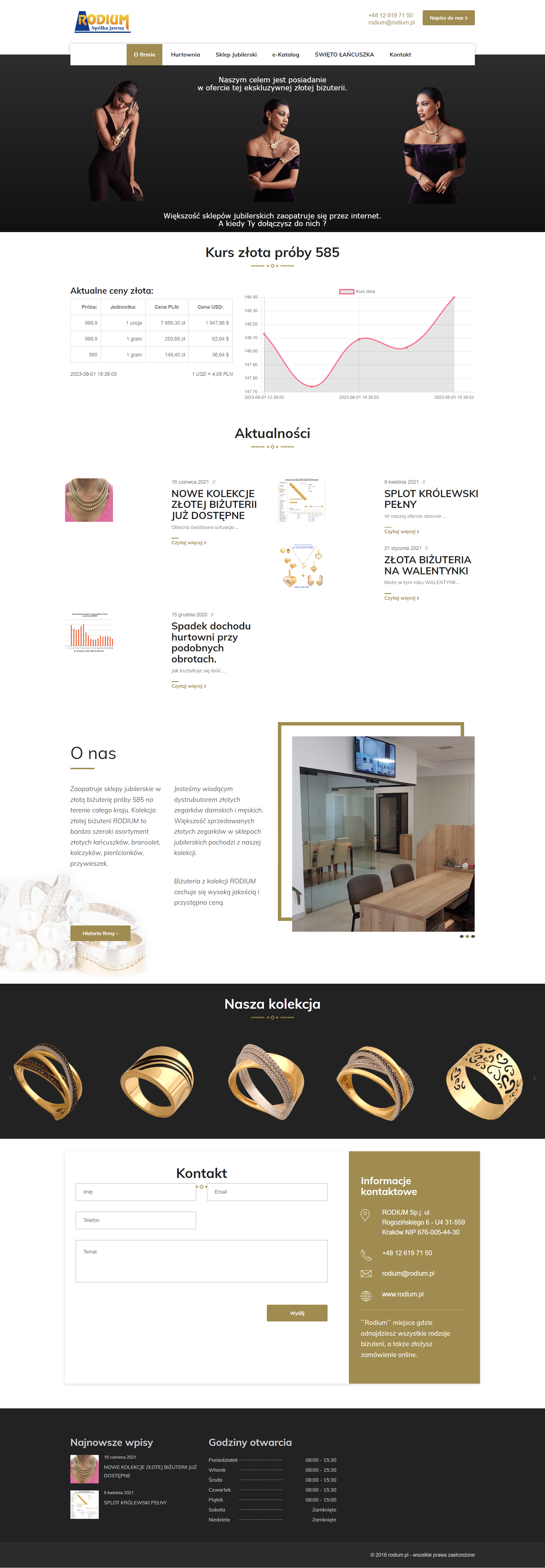 Jesteśmy głównym dostawcą złotej biżuterii próby 585 dla jubilerów na terenie całego kraju. Nasza kolekcja złotej biżuterii RODIUM obejmuje rozległy wybór łańcuszków, bransoletek, kolczyków, pierścionków i przywieszek. Dodatkowo, jesteśmy liderem w dystrybucji złotych zegarków dla kobiet i mężczyzn. Większość dostępnych w jubilerskich sklepach złotych zegarków pochodzi z naszej kolekcji. Nasza biżuteria z kolekcji RODIUM wyróżnia się nie tylko wysoką jakością, lecz także atrakcyjnymi cenami. Zapewniamy naszym klientom szeroki wybór eleganckich i trwałych produktów, które spełnią oczekiwania nawet najbardziej wymagających klientów. Jako zaufany dystrybutor, oferujemy kompleksową gamę produktów, zapewniając jednocześnie profesjonalną obsługę. Wybierając naszą biżuterię i zegarki, inwestujesz w jakość, styl i niepowtarzalny design. Zapraszamy do współpracy.