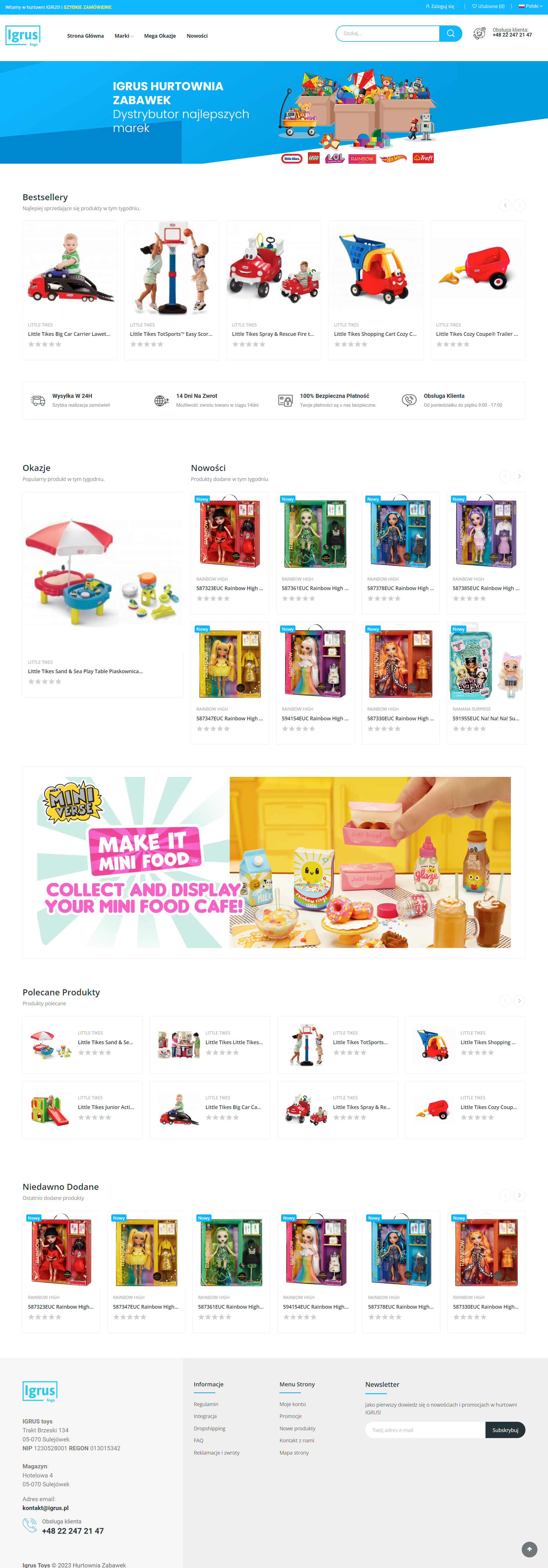 Igrus to renomowana hurtownia zabawek, specjalizująca się w ofercie wiodących producentów, takich jak Lego, LOL, Tobi, PalPlay i wielu innych. Jako dystrybutor najlepszych marek, zapewniamy bogaty asortyment i wysoką jakość produktów. Oferujemy elastyczne formy współpracy, obejmując zarówno model dropshipping, jak i tradycyjny hurt. Zapraszamy do zaznajomienia się z naszą różnorodną ofertą, która spełnia oczekiwania zarówno małych, jak i dużych klientów. Dzięki współpracy z Igrus, zyskujesz dostęp do atrakcyjnych marek oraz możliwość elastycznego dostosowania modelu współpracy do własnych preferencji i potrzeb biznesowych. Niezależnie od tego, czy jesteś zainteresowany dropshippingiem, czy hurtowymi zamówieniami, zapewniamy profesjonalizm i szeroki wybór wysokiej jakości zabawek.