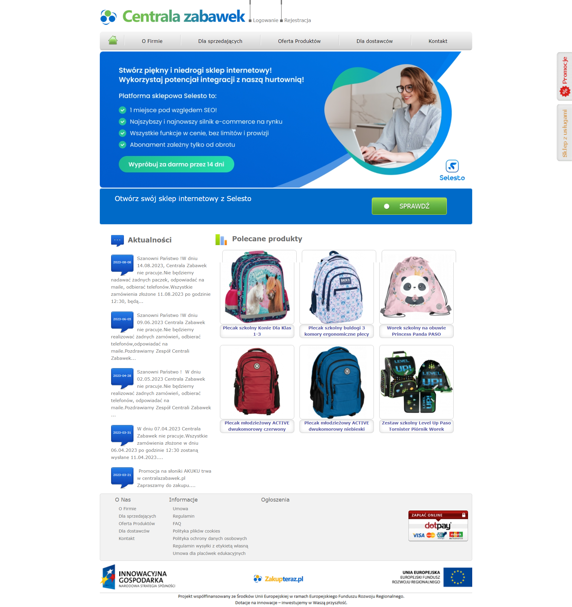 Centralazabawek.pl to internetowa hurtownia zabawek oraz artykułów dla dzieci (ale nie tylko), która została stworzona specjalnie, aby obsługiwać sklepy internetowe – dostarczamy towary wg modelu dropshipping. Zaopatrujemy również sklepy stacjonarne, a także placówki edukacyjne a towary wysyłamy bezpośrednio do Klientów naszych Partnerów. Dokładamy wszelkich starań, aby nasi Partnerzy i ich Klienci byli zadowoleni z naszych towarów oraz szybkiej i profesjonalnej obsługi. Współpracujemy z rzetelnymi dostawcami zapewniającymi towary dobrej jakości. W naszej pracy stawiamy na lojalność oraz uczciwość wobec naszych Dostawców. Wciąż doskonalimy organizację naszej pracy oraz nasz autorski system a wszystko dlatego, bo zależy nam na współpracy długofalowej, co pozwala na dynamiczny wzrost naszych Dostawców, Partnerów i oczywiście Naszej Internetowej Hurtowni Dropshippingowej.