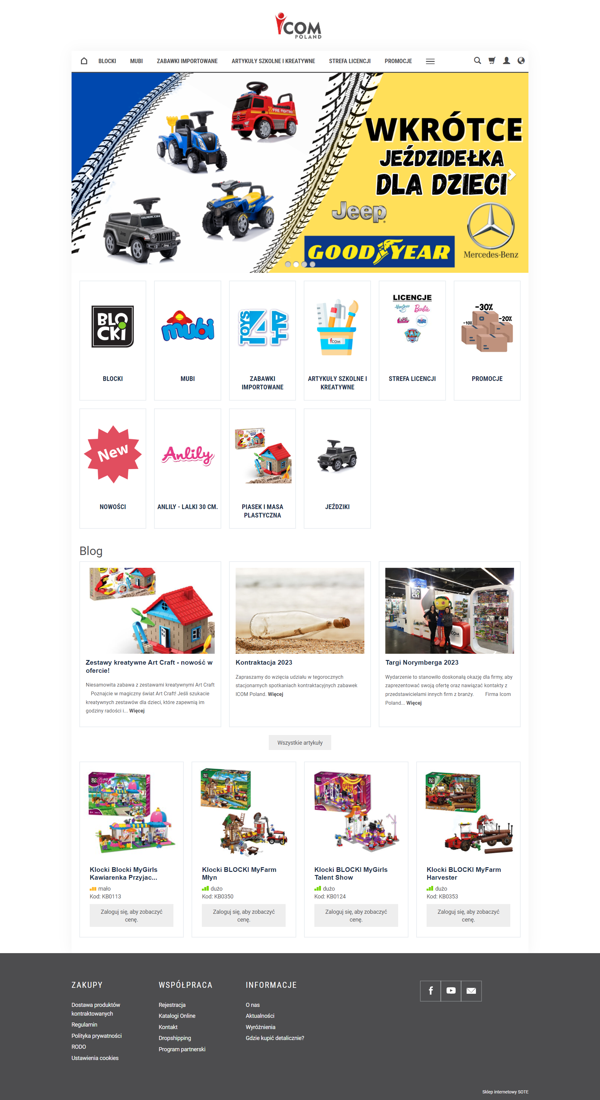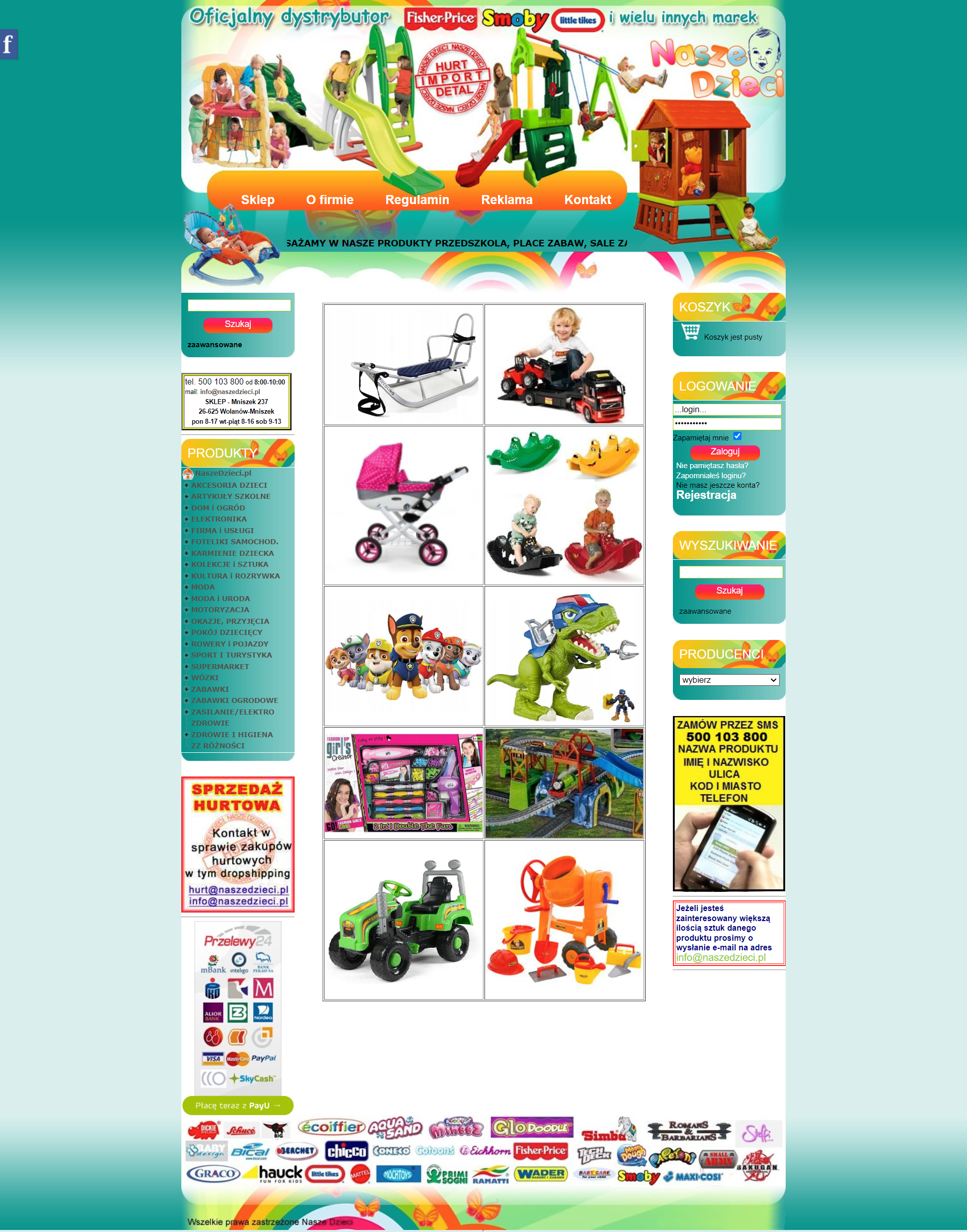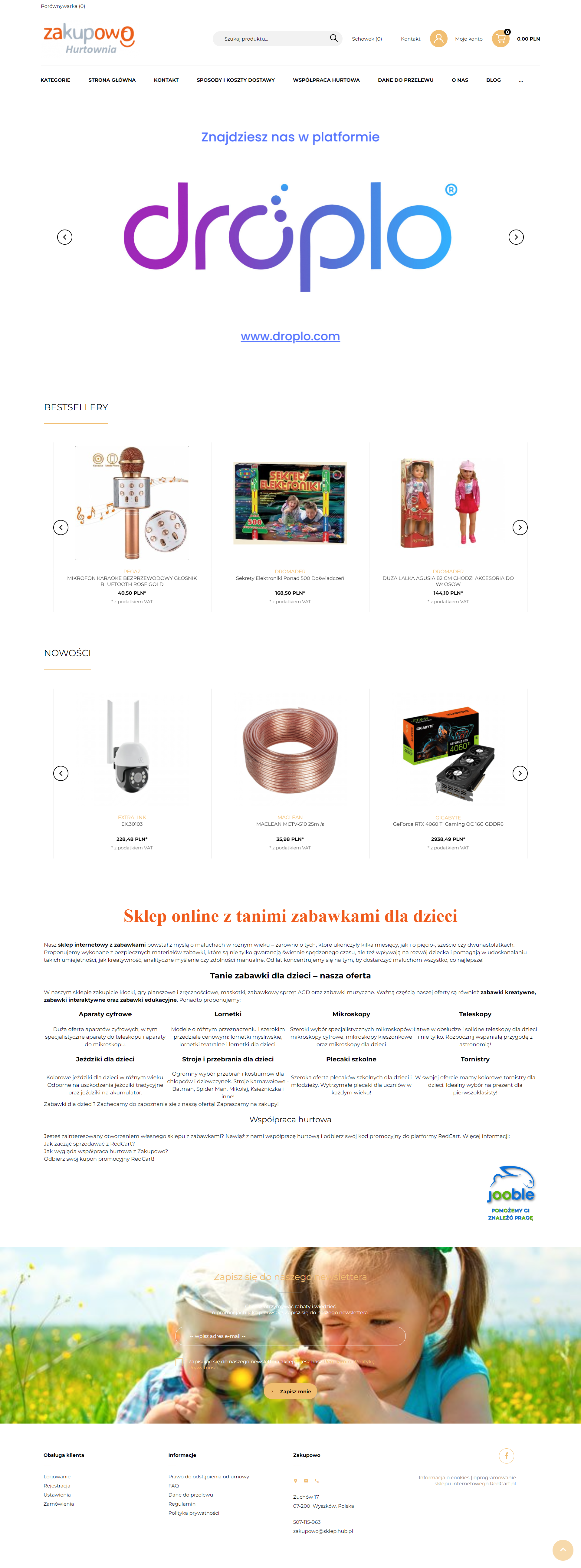 Oferujemy wysokiej jakości produkty przeznaczone dla dzieci. Zapraszamy do współpracy hurtowników, którzy są zainteresowani sprzedażą stacjonarną, jak i internetową. Obsługujemy również nowoczesne rozwiązanie handlowe, pozwalające małym i dużym przedsiębiorcom na powiększenie swojego asortymentu, nie zwiększając tym samym własnej powierzchni magazynowej, czyli sprzedaż w modelu dropshipping na terenie kraju oraz za granicą. W naszej ofercie znajdziecie Państwo: zabawki dla dzieci i niemowląt, edukacyjne, kreatywne, plastyczne, muzyczne, sportowe, gry i inne, pojazdy na akumulator takie jak: auta, quady, motocykle, traktory, trampoliny, baseny i akcesoria, wózki dla lalek, drewniane zabawki m.in. domki dla lalek, toaletki, kuchnie, części zamiennie do pojazdów akumulatorowych. Zapraszamy do współpracy.