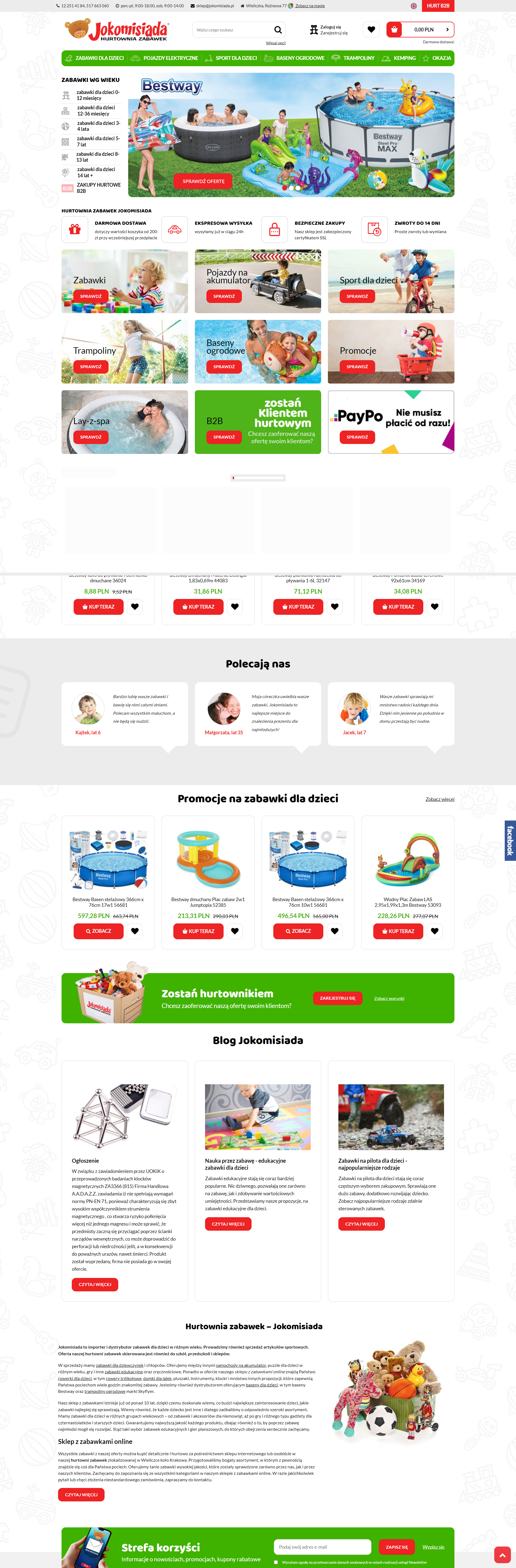Jokomisiada to importer i dystrybutor zabawek dla dzieci w różnym wieku. Prowadzimy również sprzedaż artykułów sportowych. Oferta naszej hurtowni zabawek skierowana jest również do szkół, przedszkoli i sklepów. W sprzedaży mamy zabawki dla dziewczynek i chłopców. Oferujemy między innymi samochody na akumulator, puzzle dla dzieci w różnym wieku, gry i inne zabawki edukacyjne oraz zręcznościowe. Ponadto w ofercie naszego sklepu z zabawkami online znajdą Państwo rowerki dla dzieci, w tym rowery trójkołowe, domki dla lalek, pluszaki, instrumenty, klocki i mnóstwo innych propozycji, które zapewnią Państwa pociechom wiele godzin znakomitej zabawy. Jesteśmy również dystrybutorem oferującym baseny dla dzieci, w tym baseny Bestway.