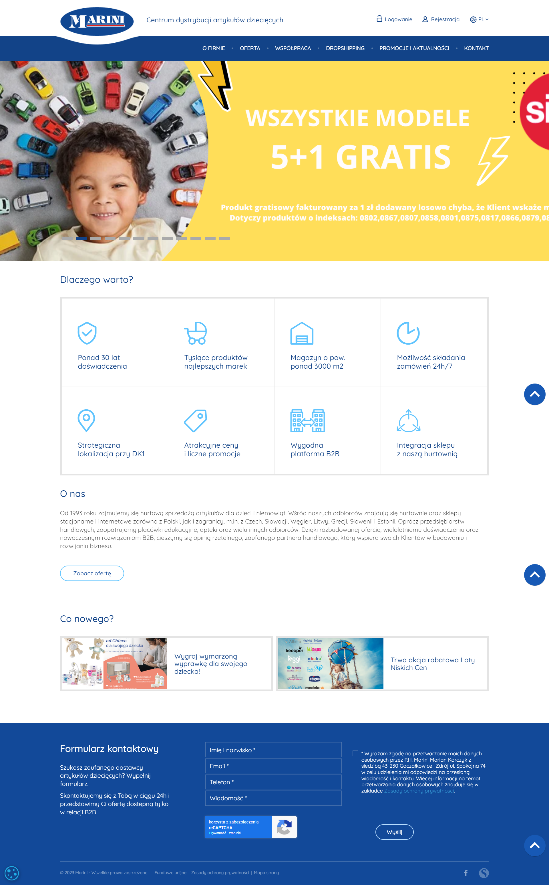 Zaopatrujemy sklepy i hurtownie w produkty dziecięce, obsługując rynki m.in. Czech, Słowacji, Węgier, Niemiec i Estonii. Z 25-letnim doświadczeniem, umocniliśmy naszą pozycję w kraju i za granicą. Dysponujemy nowoczesną siedzibą o pow. 3000 m2, zapewniającą sprawną logistykę. Rozwijamy ofertę i zwiększamy dostępność dzięki rozbudowanej sieci dostawców. Nasza strategiczna lokalizacja oraz nowoczesne zaplecze logistyczne umożliwiają dynamiczny rozwój. Jako solidny partner, stale reagujemy na zmieniające się potrzeby rynku, oferując kompleksowe rozwiązania dla naszych klientów. Zapraszamy do odwiedzenia naszej strony internetowej www.marini.pl znajdziecie tam Państwo naszą pełną ofertę. Zapraszamy do współpracy. Zapraszamy do naszej siedziby w Goczałkowicach-Zdroju przy DK1.