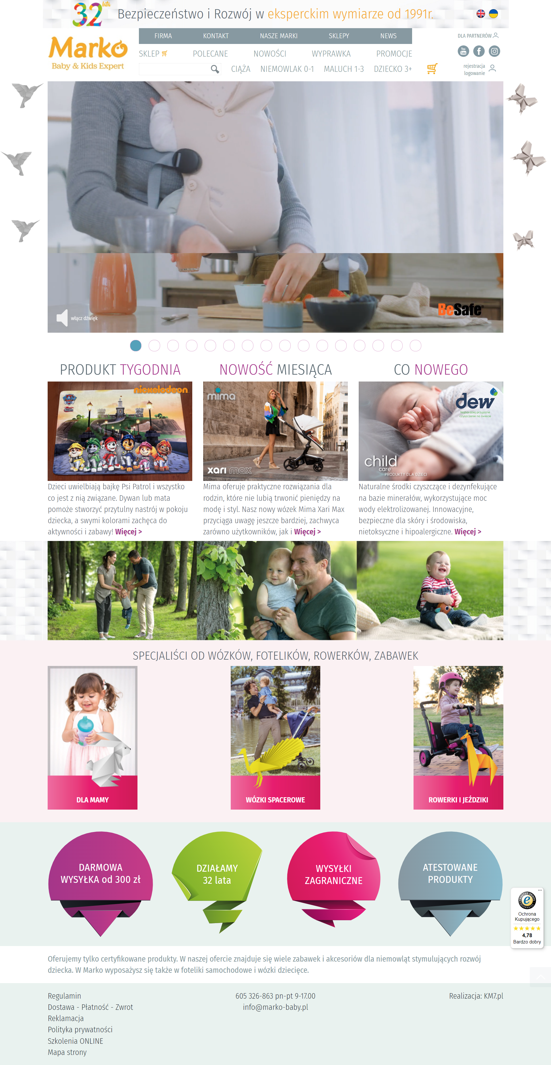 Jesteśmy oficjalnym i wyłącznym dystrybutorem kilkudziesięciu największych marek produkujących zabawki i akcesoria dla dzieci. Oferujemy tylko certyfikowane produkty. W naszej ofercie znajduje się wiele zabawek i akcesoriów dla niemowląt stymulujących rozwój dziecka. W Marko wyposażysz się także w foteliki samochodowe i wózki dziecięce. Wysoka jakość i trwałość naszych produktów to cechy, które zapewniły nam osiągnięcie czołowej pozycji w niezwykle konkurencyjnej branży. Marko jest autoryzowanym i wyłącznym dystrybutorem uznanych, światowych marek, takich jak, BeSafe, Tiny Love, K’s Kids, Love to Dream, Alilo, Trunki, Dreambaby, Nanobebe, i wielu innych. Marko jest firmą przyjazną i aktywnie uczestniczącą w życiu lokalnej społeczności. Z racji profilu działalności jest mile widzianym sponsorem wszelakich akcji charytatywnych.