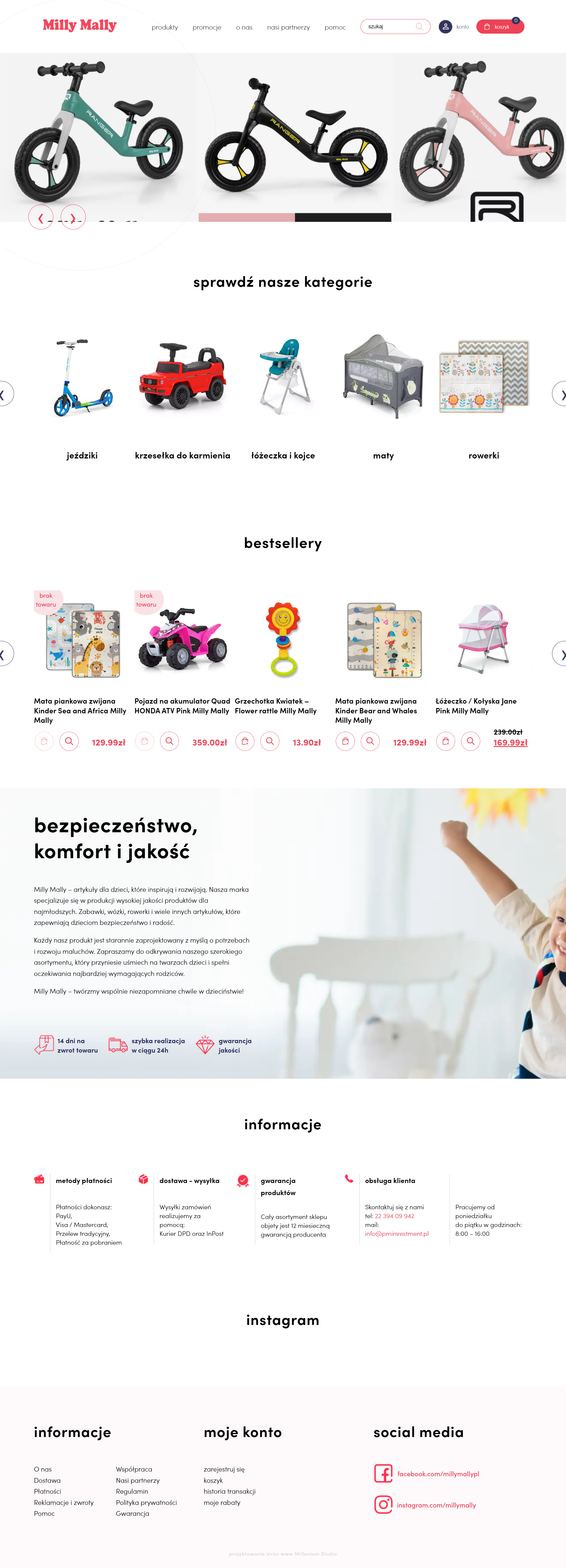 Milly Mally – artykuły dla dzieci, które inspirują i rozwijają. Nasza marka specjalizuje się w produkcji wysokiej jakości produktów dla najmłodszych. Zabawki, wózki, rowerki i wiele innych artykułów, które zapewniają dzieciom bezpieczeństwo i radość. Każdy nasz produkt jest starannie zaprojektowany z myślą o potrzebach i rozwoju maluchów. Zapraszamy do odkrywania naszego szerokiego asortymentu, który przyniesie uśmiech na twarzach dzieci i spełni oczekiwania najbardziej wymagających rodziców. Zapraszamy na nasza stronę internetową www.millymally.pl tam znajdziecie naszą pełną ofertę.