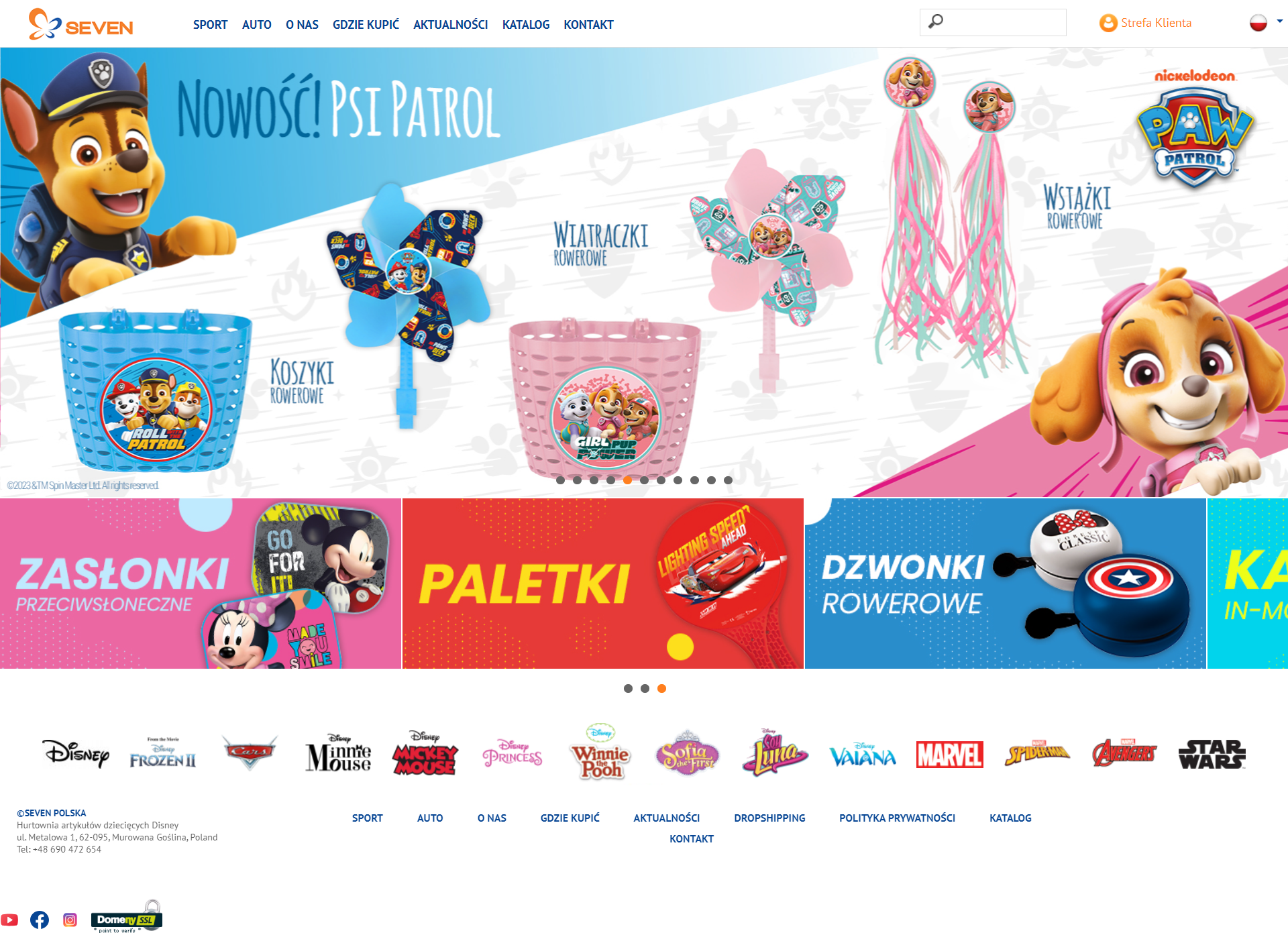 Seven Polska to ceniony producent i dystrybutor dziecięcych artykułów sportowych i samochodowych na licencji Disney. Z ponad wiekowym doświadczeniem, oferujemy rowerki biegowe, kaski, ochraniacze, dzwonki, rękawiczki, siedziska, foteliki, zasłonki, rolety przeciwsłoneczne, organizery i inne. Nasze produkty to nie tylko funkcjonalność, ale również estetyka. Zgodnie z najnowszymi trendami projektujemy artykuły ozdobione motywami z ulubionych bajek Disney’a, co sprawia, że podróż staje się nie tylko bezpieczna, ale i magiczna. Zapraszamy do odkrywania naszej różnorodnej oferty, która nie tylko spełnia najwyższe standardy bezpieczeństwa, ale także przyciąga uwagę unikalnymi wzorami. Seven Polska to gwarancja satysfakcji dla rodziców i radości dla dzieci podczas każdej podróży czy aktywności sportowej.