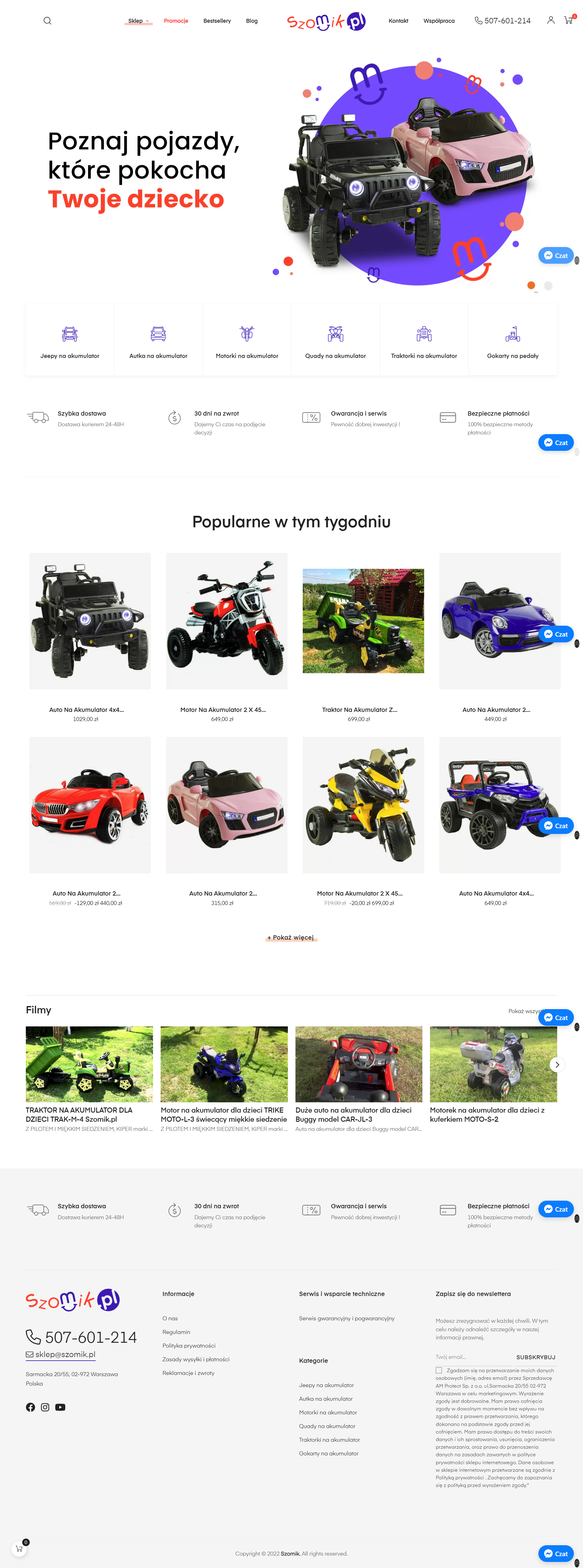 Jeśli uwielbiasz sprawiać radość dzieciom to znalazłeś się w idealnym miejscu. Szomik to sklep online, gdzie znajdziesz pojazdy na akumulatory, które pokocha Twoje dziecko. Oferujemy: autka, jeepy, motorki, quady, traktorki jak również gokarty na pedały. Nasz zespół mocno dba, aby oferta była jak najbardziej atrakcyjna i zróżnicowana. Dzięki czemu, nawet najbardziej wymagający klienci mają szansę na trafiony zakup. Wybieramy tylko takie produkty, które są bezpieczne dla Twojego dziecka. Zawsze chętnie służymy radą i pomocą. Zapraszamy na nasza stronę internetową www.szomik.pl tam znajdziecie naszą pełną ofertę. Zapraszamy do współpracy.